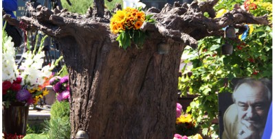 Пам’ятник на могилі актора почали встановлювати напередодні, 25 серпня. Монумент виконаний у вигляді дуба, перевернутого корінням догори, автором якого є одеський скульптор Михайло Рева.