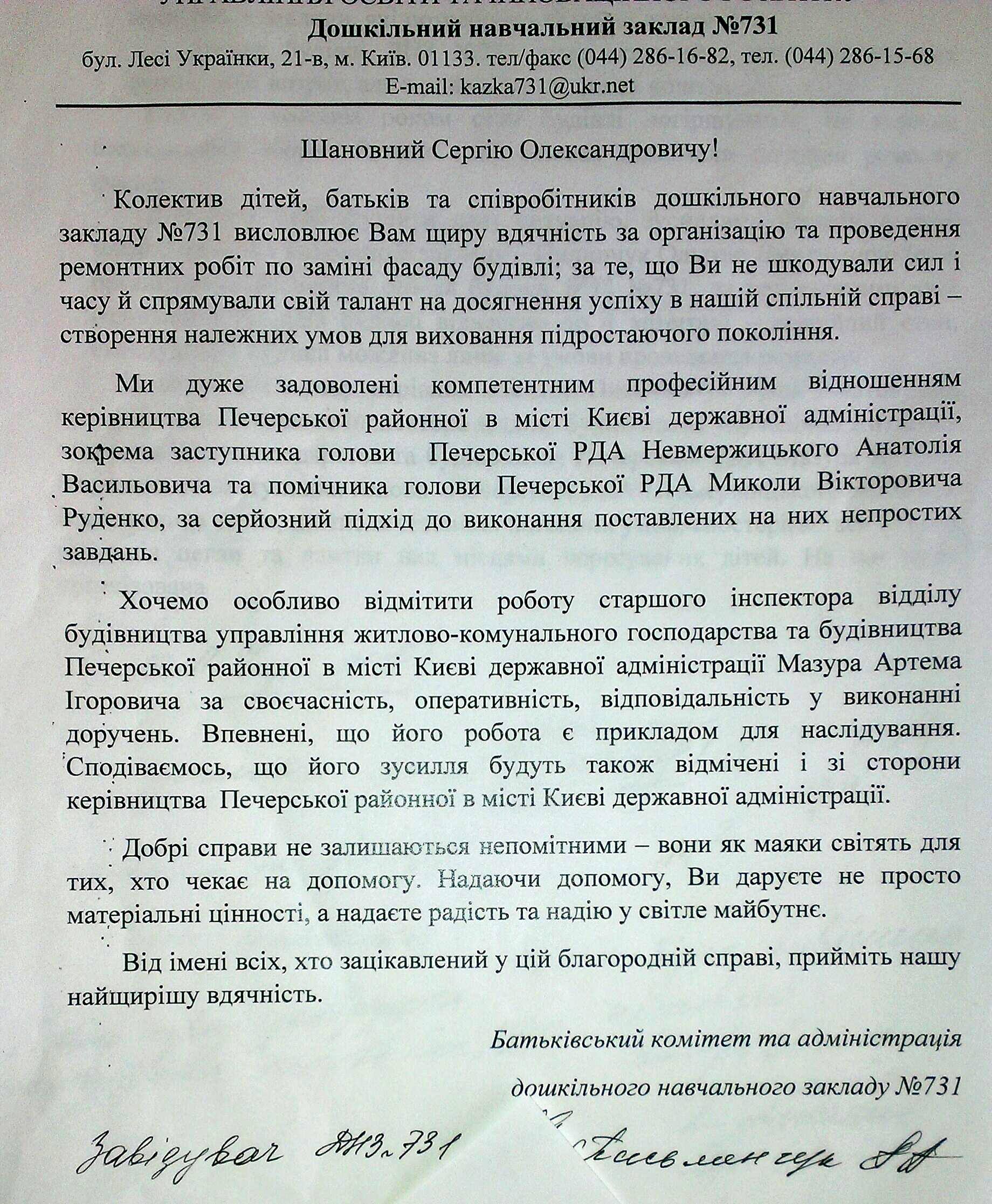 На ім’я голови Печерської районної в місті Києві державної адміністрації Сергія Мартинчука надійшов лист-подяка від колективу батьків та співробітників дошкільного навчального закладу №731: