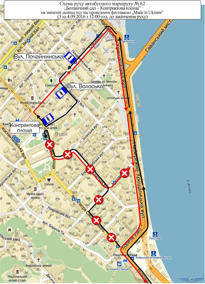 – автобуси маршруту № 62 курсуватимуть від Ботанічного саду до Володимирського узвозу за діючим маршрутом, далі за трасою – вул. Набережно-Хрещатицька – вул. Спаська – вул. Волоська – вул. Сковороди – вул. Межигірська – вул. Спаська – вул. Набережно-Хрещатицька – Боричів узвіз – Володимирський узвіз, далі за діючим маршрутом;