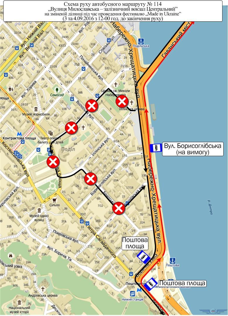 – автобуси маршруту № 114 (R1) курсуватимуть в напрямку залізничного вокзалу «Центральний» від вул. Милославської до вул. Набережно-Хрещатицької за діючим маршрутом, далі за трасою – Боричів узвіз – Володимирський узвіз (без заїзду на Контрактову площу), далі за діючим маршрутом;