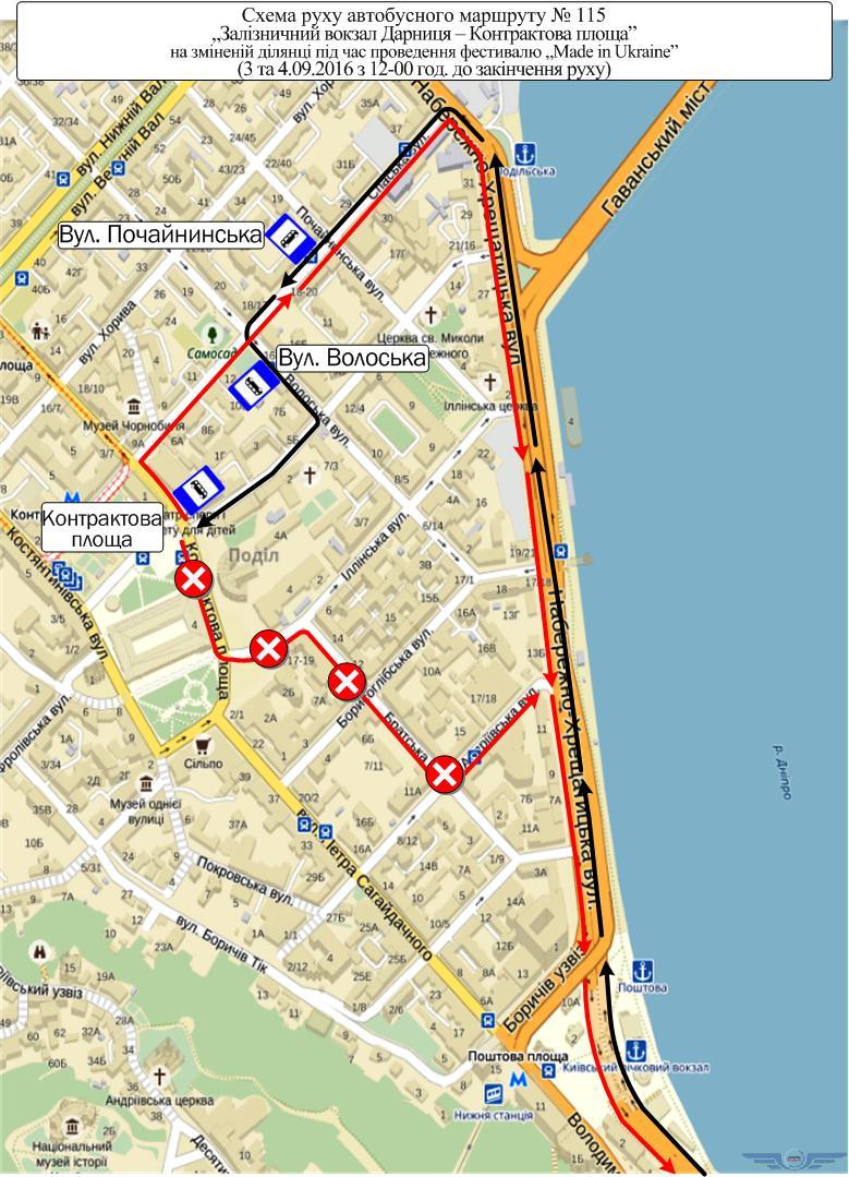 – автобуси маршруту № 115 курсуватимуть від залізничної станції «Дарниця» до вул. Сковороди за діючим маршрутом, далі за трасою – вул. Межигірська – вул. Спаська – вул. Набережно-Хрещатицька, далі за діючим маршрутом.