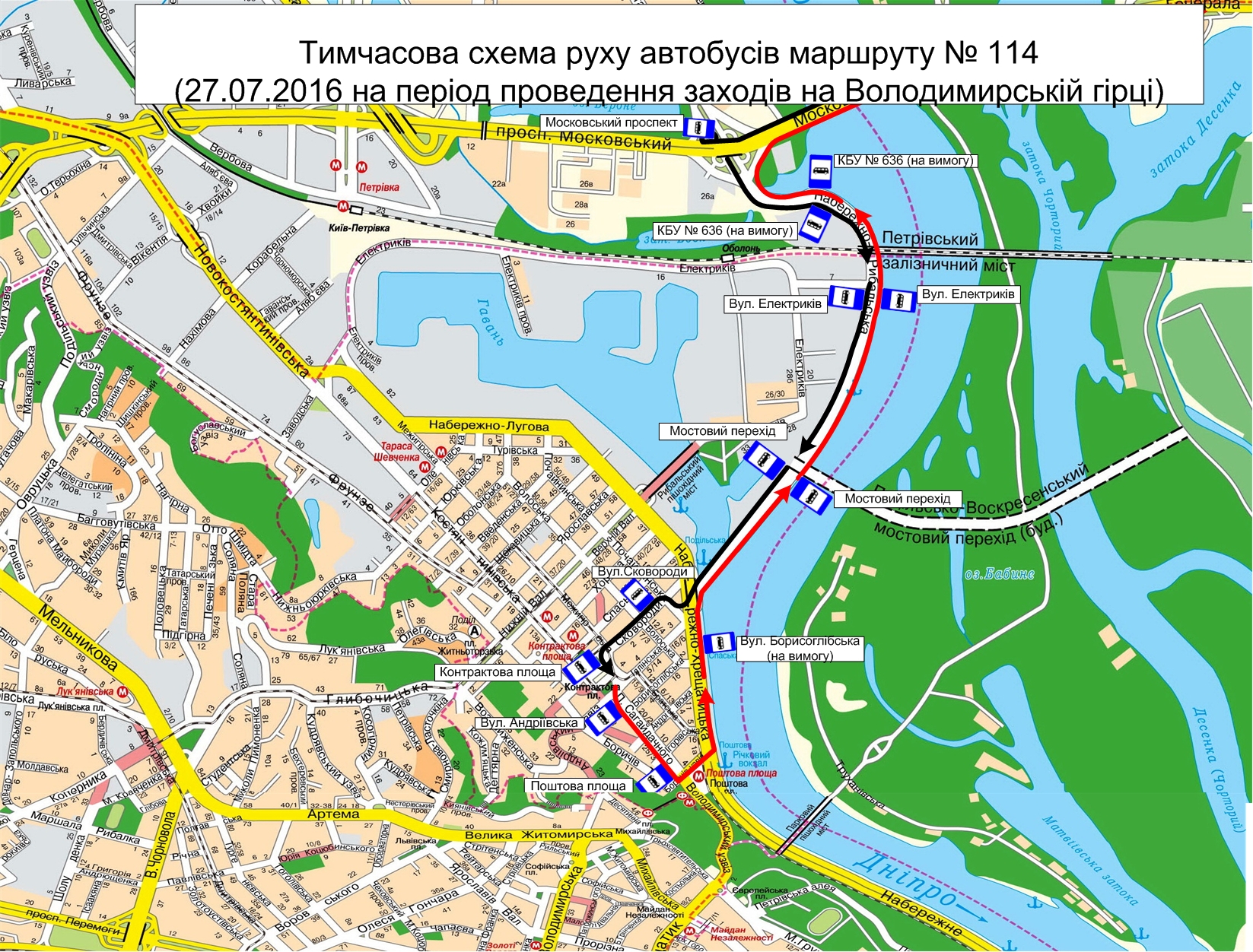– автобуси маршруту № 114 (R1) курсуватимуть від вул. Милославської до Поштової площі за трасою: від вул. Милославська до вул. Петра Сагайдачного за діючою трасою, далі Боричів тік – вул. Набережно-Хрещатицька, далі за діючою трасою.