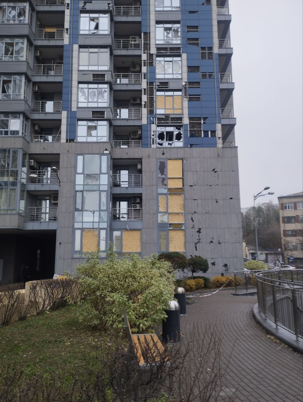 Другу добу комунальні служби ліквідовують наслідки пошкодження житлових будинків після ворожої атаки на столицю 25 листопада.