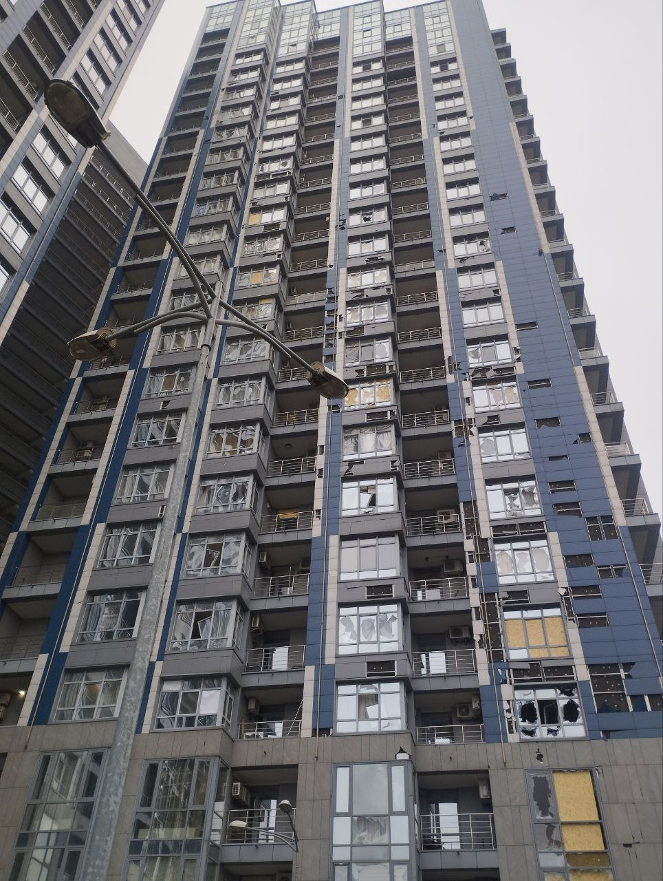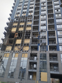 Більшість пошкоджених вікон уже зашито плитами ОСБ, що забезпечує мешканцям мінімальний захист від холоду та опадів. Завершено демонтаж аварійних та пошкоджених елементів фасаду будинку.