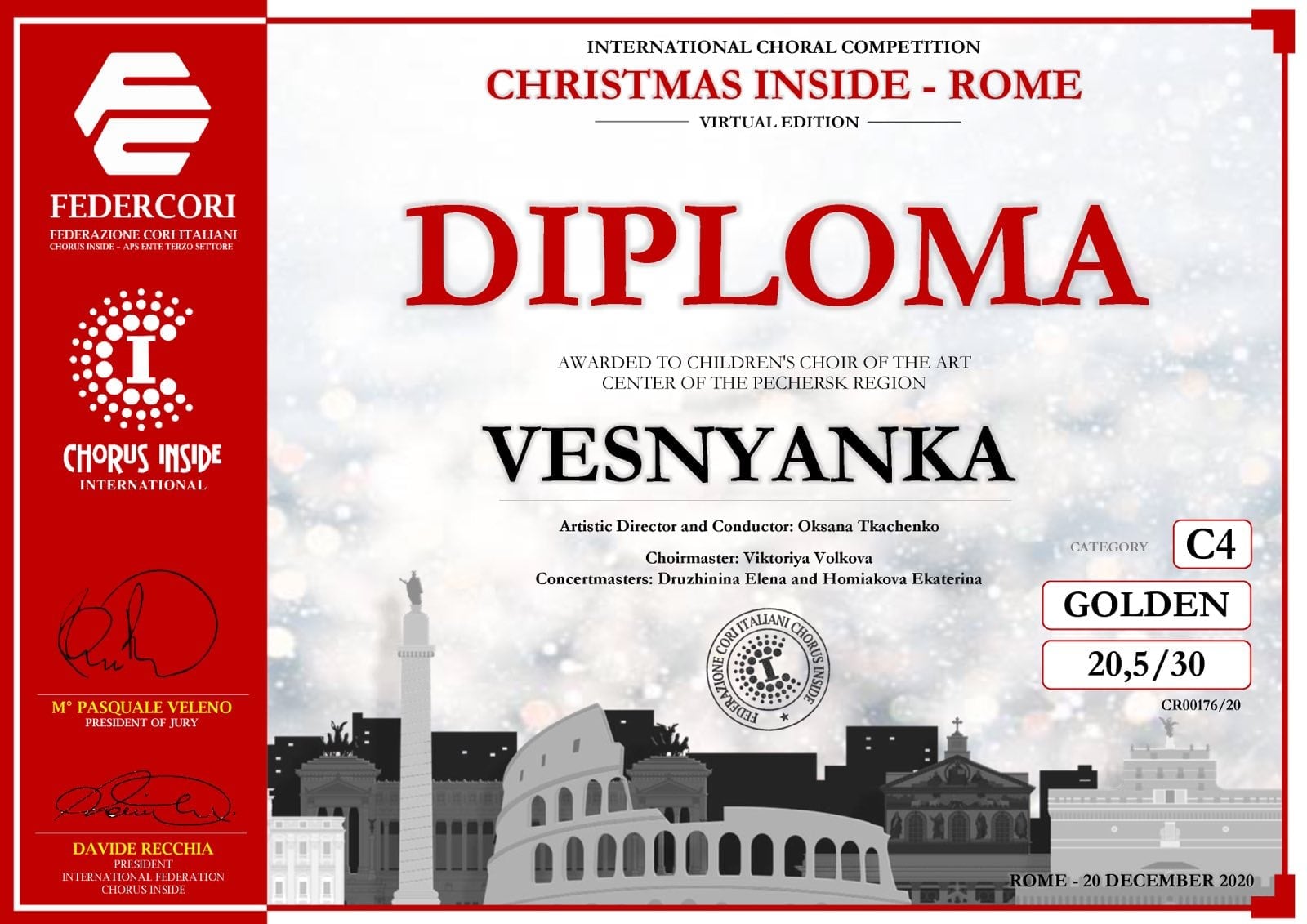 Народний художній колектив дитячий хор «Веснянка» Центру «АРТ» Печерського району м. Києва одержав перемогу у Міжнародному конкурсі хорів «CHRISTMAS INSIDE - ROME _ VIRTUAL EDITION».