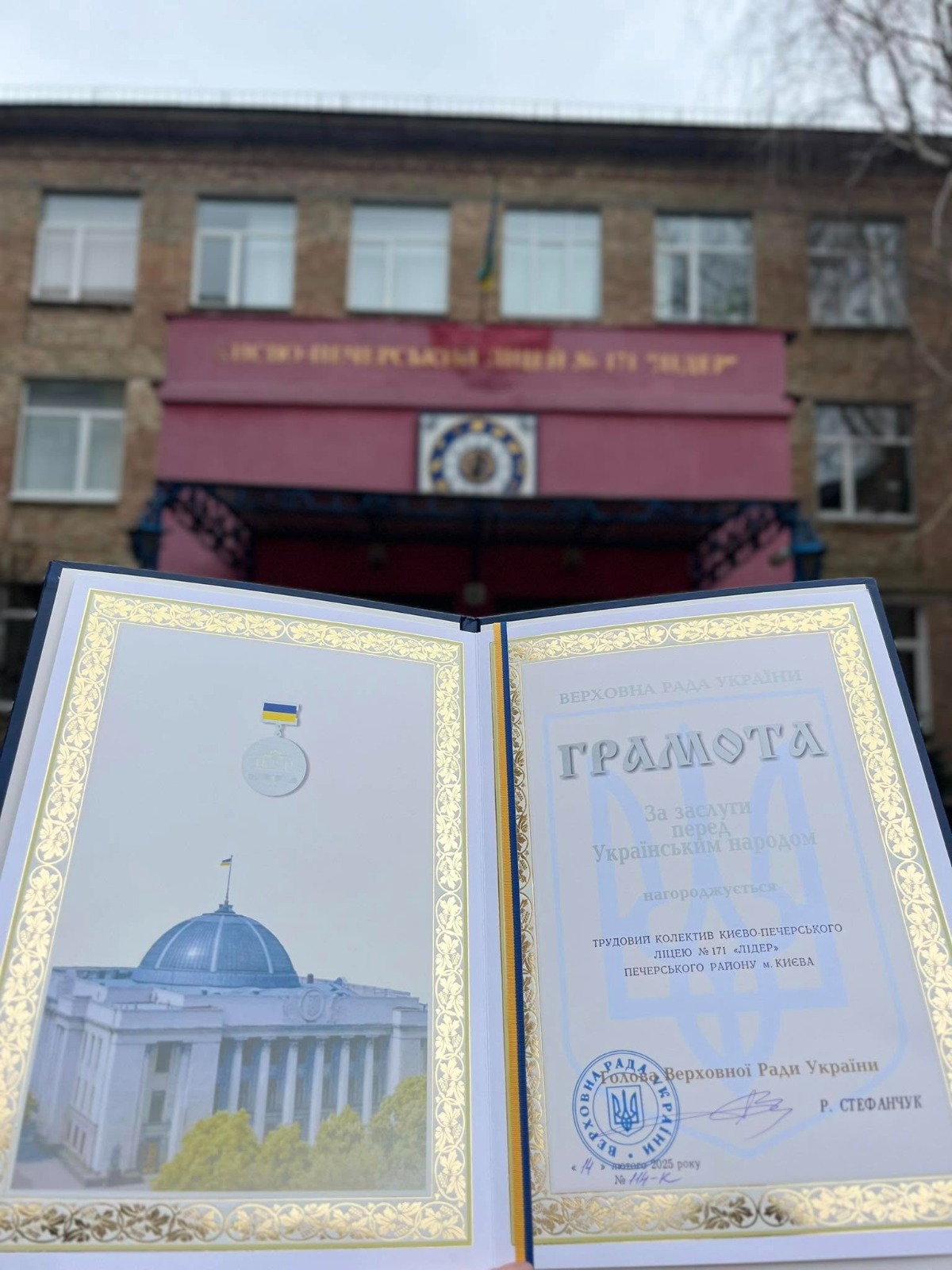Печерська районна в місті Києві державна адміністрація щиро вітає трудовий колектив Києво-Печерського ліцею № 171 «Лідер» із почесною відзнакою – Грамотою Верховної Ради України.