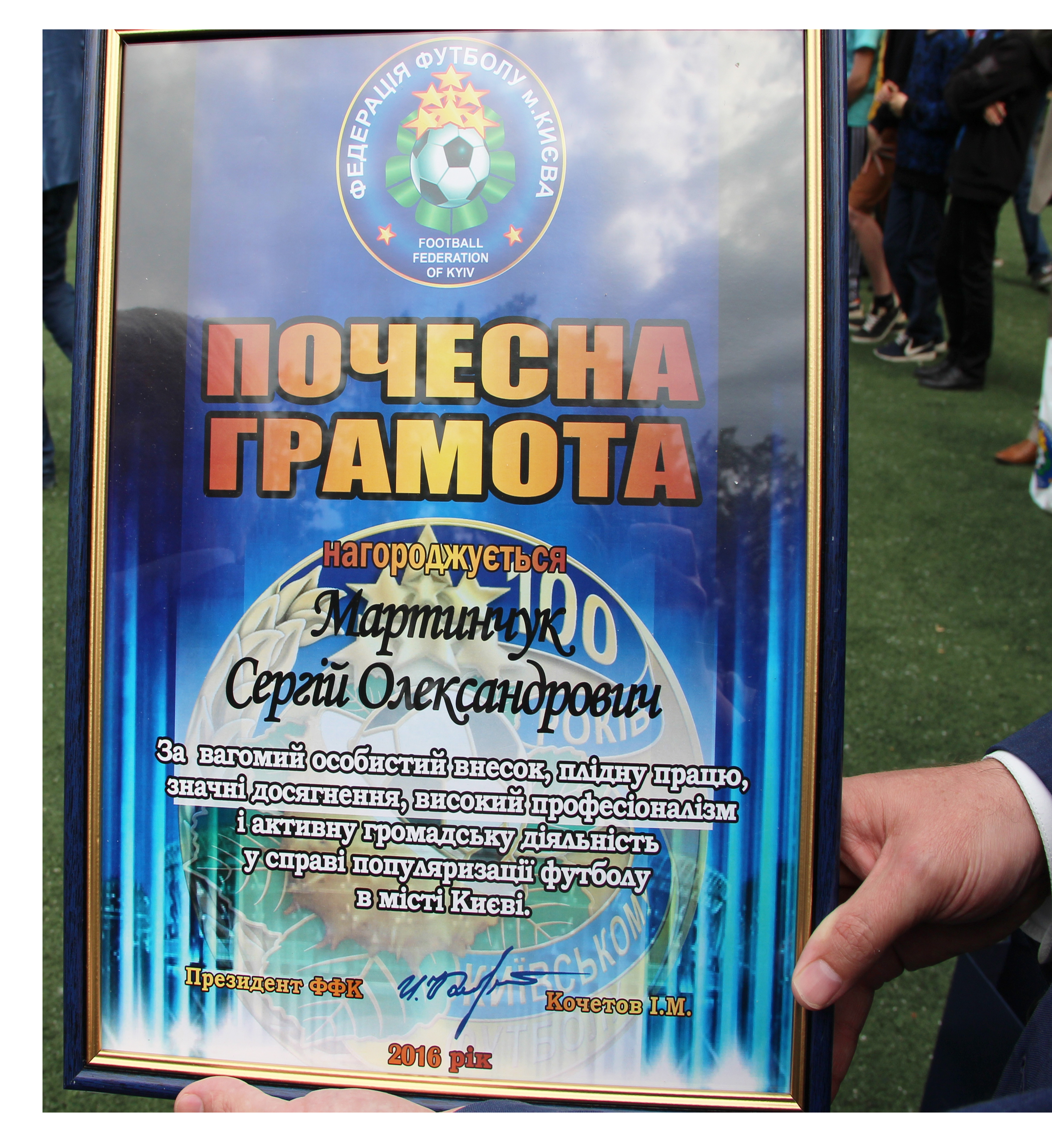 За вагомий особистий внесок, плідну працю, значні досягнення, високий професіоналізм і активну громадську діяльність у справі популяризації футболу в місті Києві Почесною Грамотою та медаллю «За заслуги-I ступеня» нагородив голову Печерської районної в місті Києві державної адміністрації Сергія Мартинчука президент Футбольної асоціації студентів міста Києва Вадим Місюра.