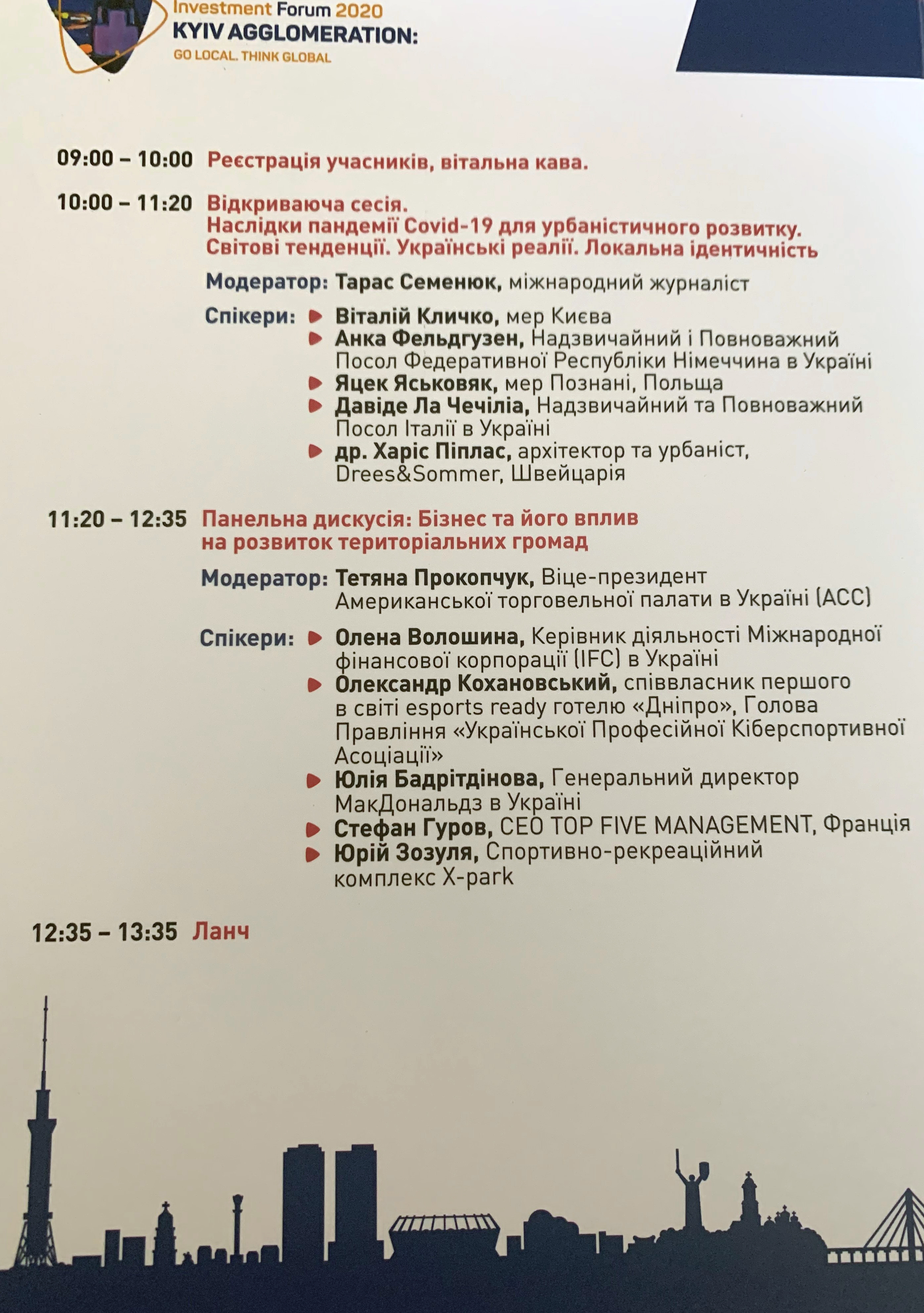 На Інвестиційному форумі було обговорено багато питань, зокрема, антикризові економічні та соціальні стратегії, розвиток локального бізнесу, екологічна безпека Київської агломерації, культурна спадщина та підвищення туристичного потенціалу, тощо.