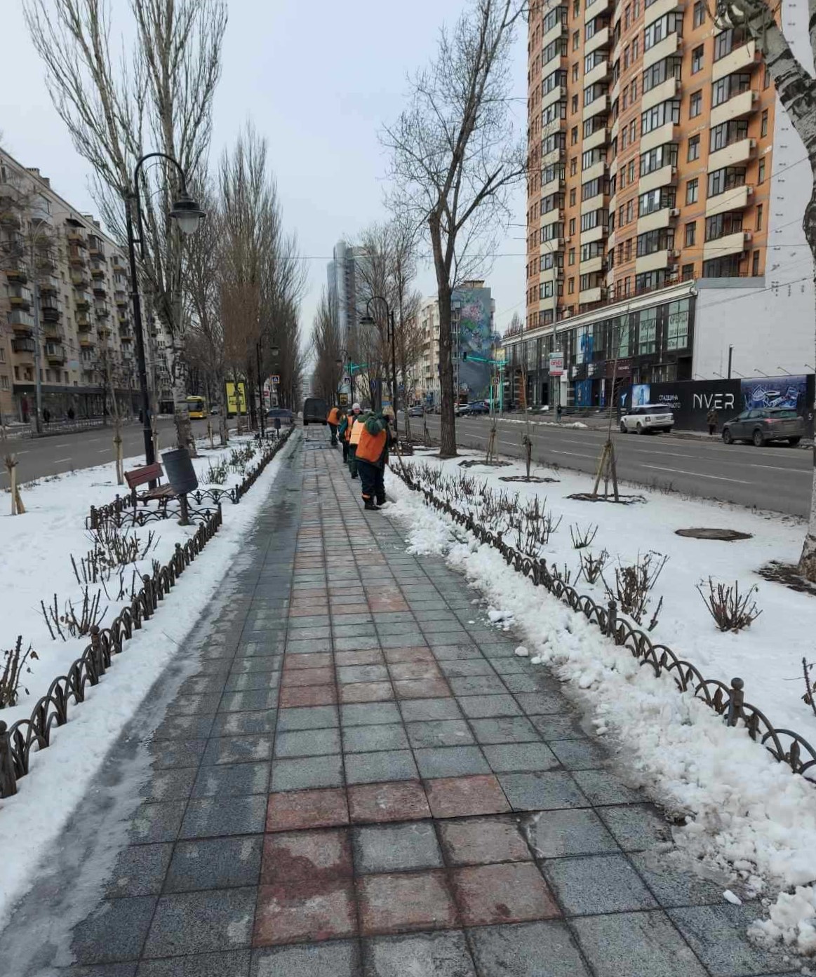 - очищення від снігу та накрижень пішохідних доріжок із твердим покриттям у парках та скверах, а також постійне посипання піщано-сольовою сумішшю;