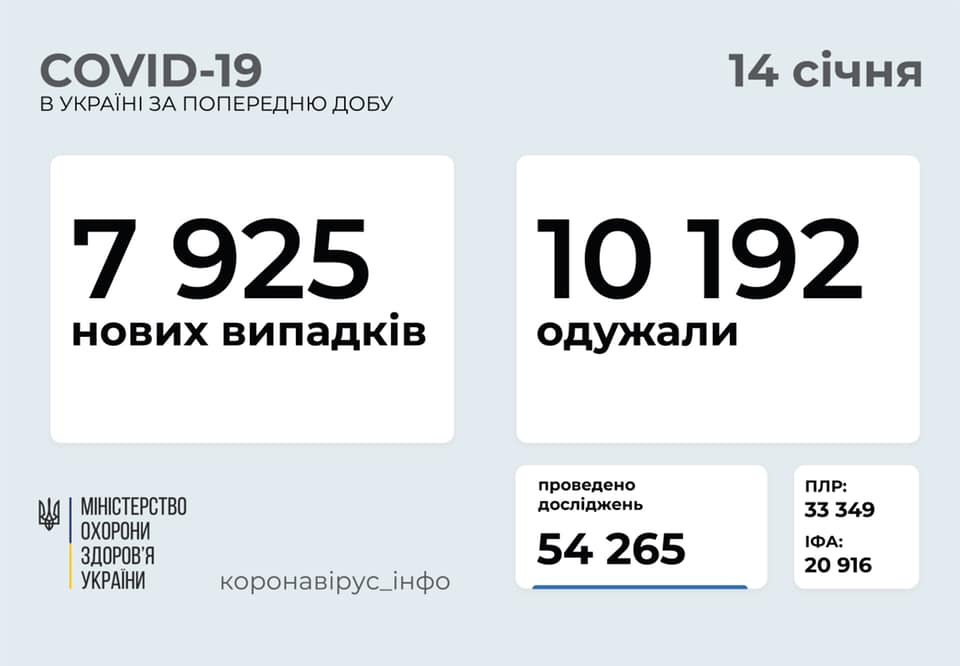 7 925 нових випадків коронавірусної хвороби COVID-19 зафіксовано в Україні станом на 14 січня 2021 року. Зокрема, захворіли 233 дитини та 345 медпрацівників.