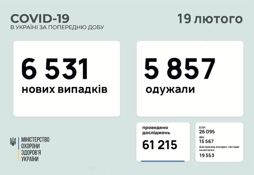 6 531 нових випадків коронавірусної хвороби COVID-19 зафіксовано в Україні станом на 19 лютого 2021 року. Зокрема, захворіли 418 дітей та 285 медпрацівників.