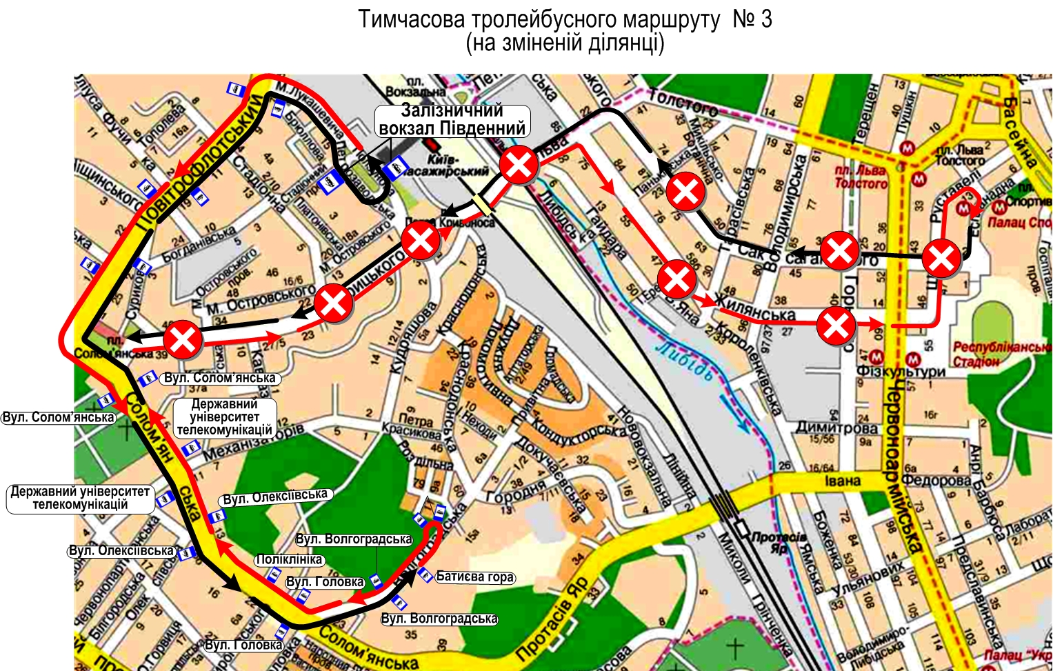 • тролейбусів маршруту № 18 – від вул. Сошенка до ст. м. «Лук’янівська» (орієнтовно з 10:00 до 14:00);