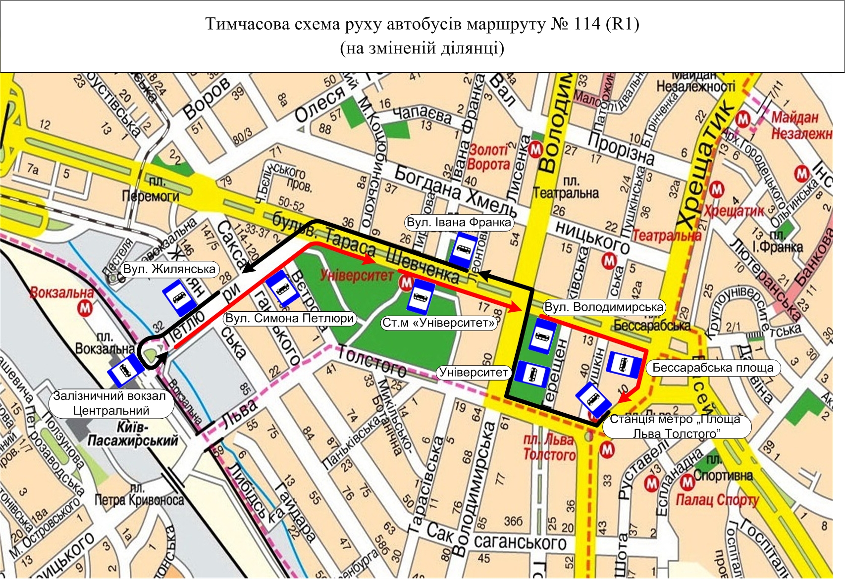Робота автобусів маршруту № 114 після відновлення руху о 15:00 у разі закриття руху по  вул. Хрещатик до закінчення заходу організовано на  двох ділянках: «вул. Милославська – Європейська площа» та від залізничного вокзалу «Центральний» до ст. м. «Площа Льва Толстого».