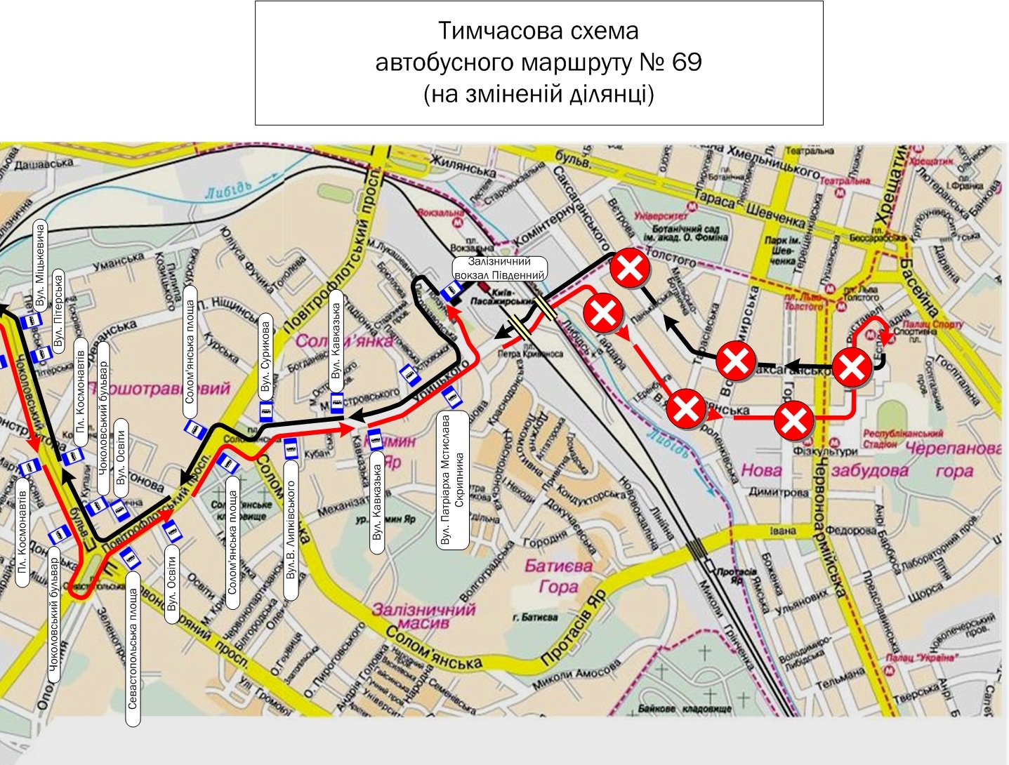 • автобусів маршруту № 69 – від вул. Литвиненко-Вольгемут до залізничного вокзалу «Південний» (орієнтовно з 9:30 до 15:00);