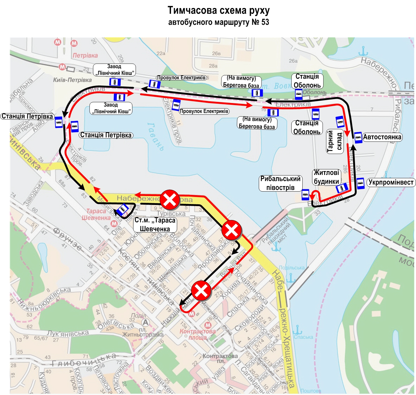 • автобусів маршруту № 53 –  від Рибальського півострова до ст. м. «Тараса Шевченка» (орієнтовно з 9:00 до 13:00);