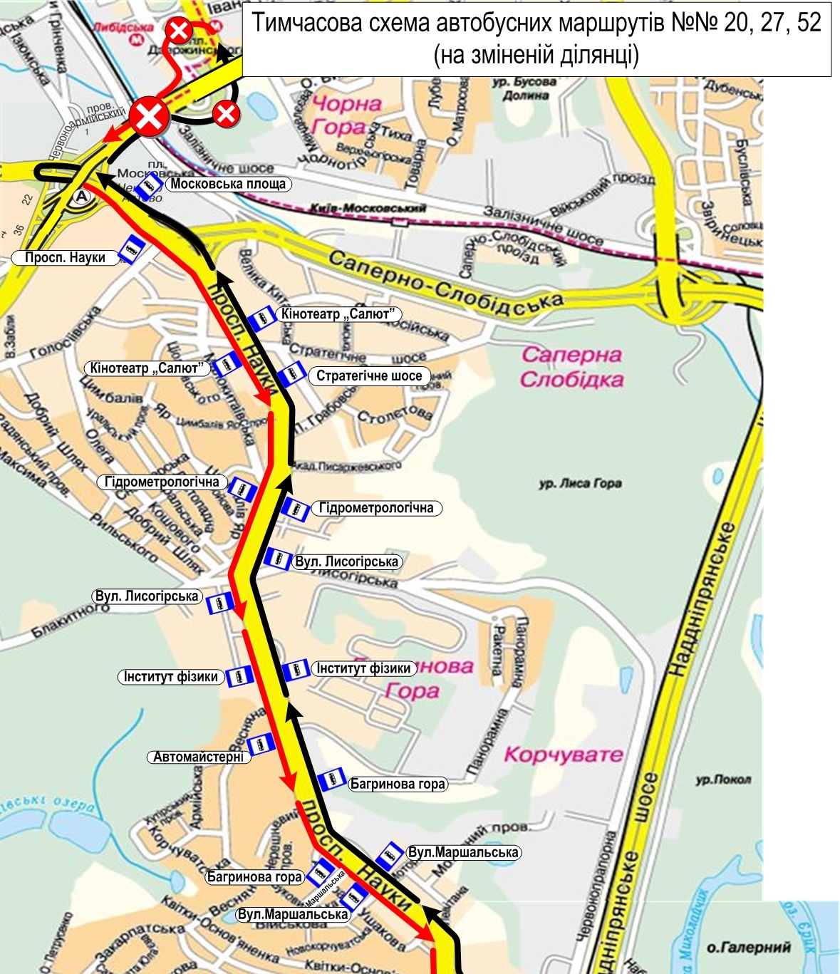 • автобусів маршруту № 52 – від вул. Закарпатської до Московської площі  (орієнтовно з 9:30 до 12:30);