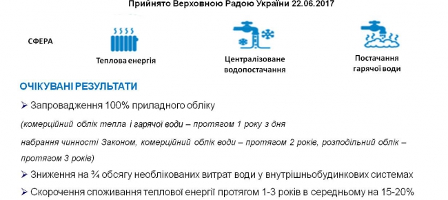 «Цей Закон запроваджує в Україні обов’язковий облік тепла і води. Завдяки цьому споживач платитиме лише за використані ресурси, а монополіст вже не зможе перекладати на споживача необґрунтовані понаднормові втрати. Крім цього, облік дозволить контролювати енергоспоживання, стимулюватиме до ощадливого використання тепла і води. Це, у свою чергу, впливатиме на зменшення рахунків за комунальні платежі», – прокоментував Голова Держенергоефективності Сергій Савчук та нагадав, що Закон розроблено у тісній співпраці з Агентством з метою імплементації низки статей Директиви 2012/27/ЄС про енергетичну ефективність.