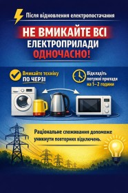 Після відновлення світла- не перевантажуйте мережу!