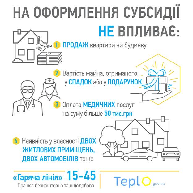 Субсидія не призначається у випадку, якщо будь-хто із зареєстрованих у житловому приміщенні членів сім’ї протягом 12 місяців перед зверненням за призначенням житлової субсидії здійснив купівлю земельної ділянки, квартири (будинку), автомобіля, будівельних матеріалів або одноразово оплатив послуги з будівництва, ремонту квартири чи будинку, автомобіля на суму, яка перевищує 50 тис. гривень. Однак і тут є виключення. Держава готова йти на зустріч тим сім’ям, які реально потребують допомоги у сплаті житлово-комунальних послуг.