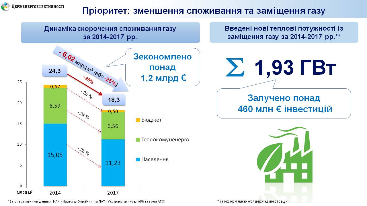У 2017 р. в Україні бюджетні установи, теплокомуненерго (ТКЕ) та населення спожили газу на 6,02 млрд м3 або на 25% менше, ніж у 2014 році.