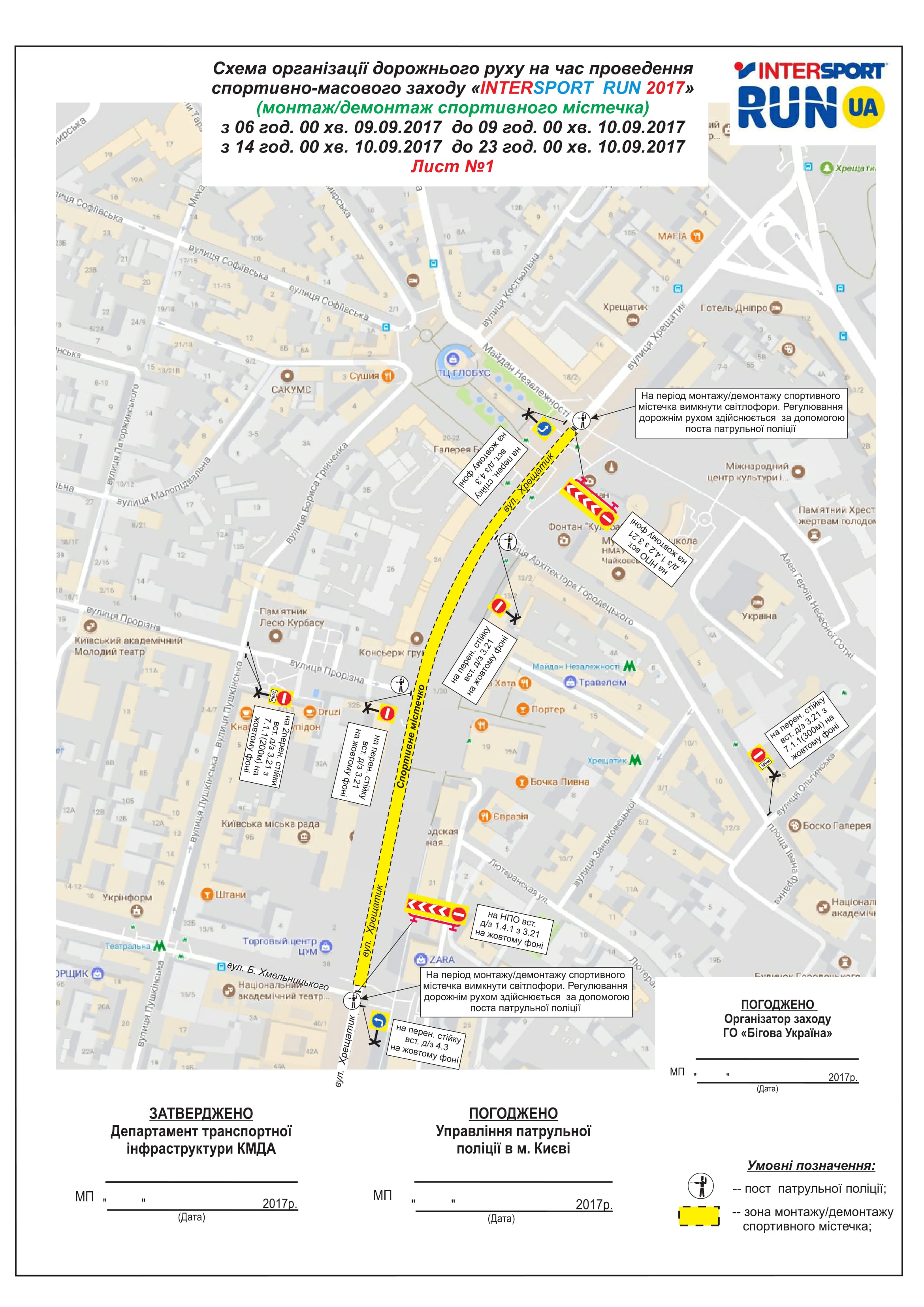 Нагадуємо, що цими вихідними, 9 та 10 вересня, у центральній частині Києва заборонять рух транспортних засобів у зв’язку з проведенням спортивно-масового заходу «Intersport Ukraine Run».