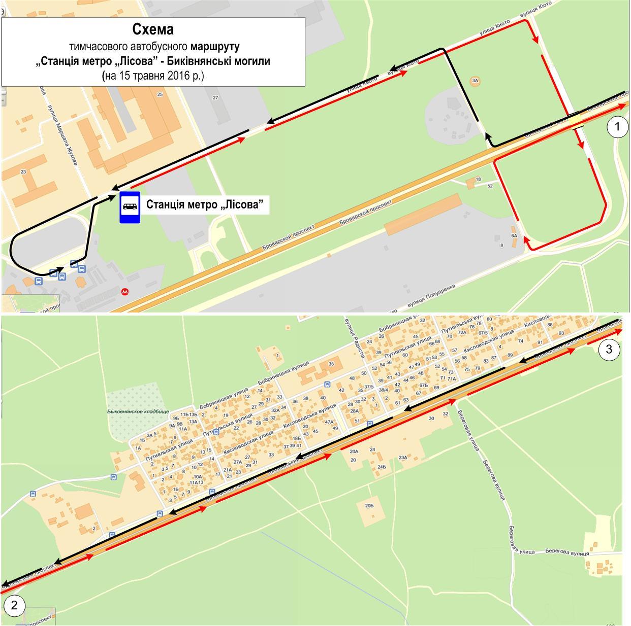Для перевезень пасажирів під час вшанування Дня пам’яті жертв політичних репресій 15 травня на території Національного історико-меморіального заповідника «Биківнянські могили» буде організовано роботу автобусного маршруту звичайного режиму руху: «ст. м. «Лісова» – Національний історико-меморіальний заповідник «Биківнянські могили».