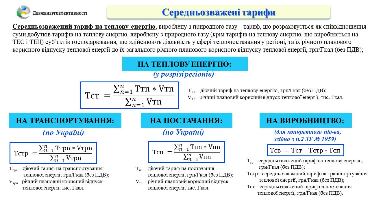 Відповідно до ЗаконуУкраїни від 21.03.2017 №1959-VIII зазначені середньозважені тарифи щоквартально, до 25 числа останнього місяця кварталу, розраховуються Держенергоефективності за інформацією НКРЕКП та органів місцевого самоврядування у порядку, затвердженому Урядом.