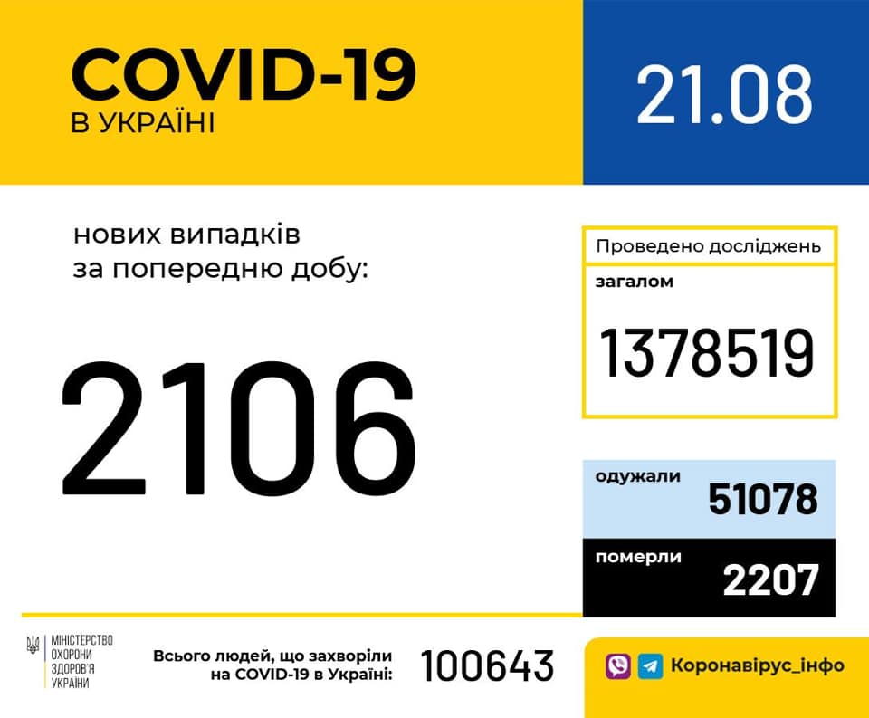 В Україні зафіксовано 2106 нових випадків коронавірусної хвороби COVID-19