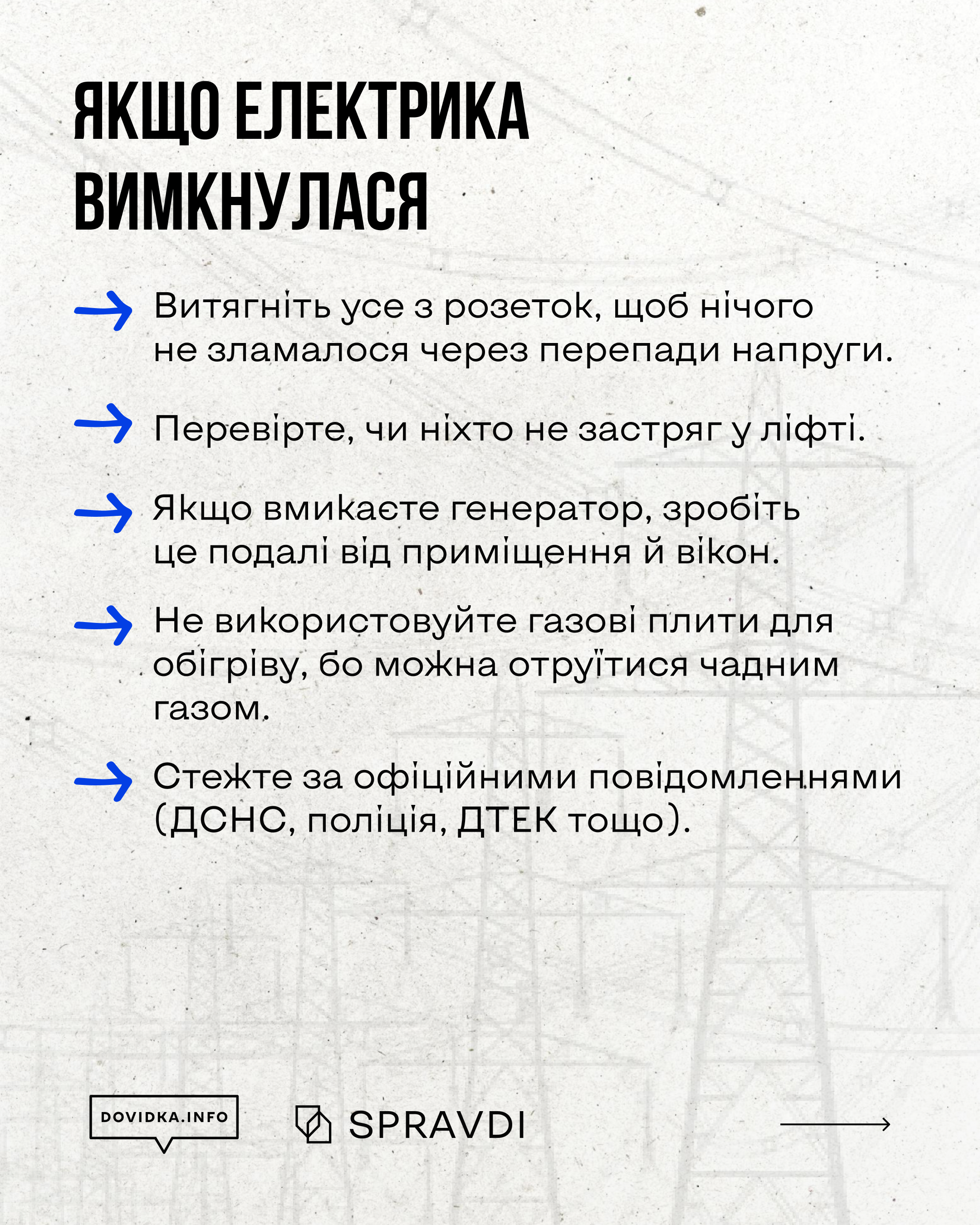 - Майте запас води, ліків, ліхтарик і павербанк;