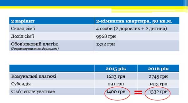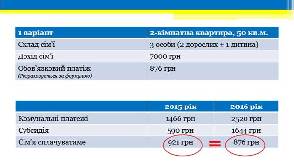 Так, для сім'ї з двох дорослих та дитини, що проживають у 2-кімнатній квартирі площею 50 кв.м. та мають дохід у 7 тис грн., обов'язковий платіж за послуги ЖКГ у 2016 році буде становити 876 грн. Для порівняння: після підвищення цін на житлово-комунальні послуги у 2015 році він сягав 1466 грн, у 2016 р. - 2520 грн, але з урахуванням субсидії у 2015 р. він становив 921 грн, а в 2016 році за новою системою буде становити 876 грн.