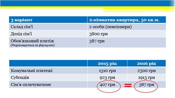 Для родини з двох осіб-пенсіонерів у двокімнатній квартирі, дохід яких сягає 3800 грн, платіж за комунальні послуги з урахуванням субсидії у 2015 р. становив 407 грн, а у 2016 році - 387 грн.
